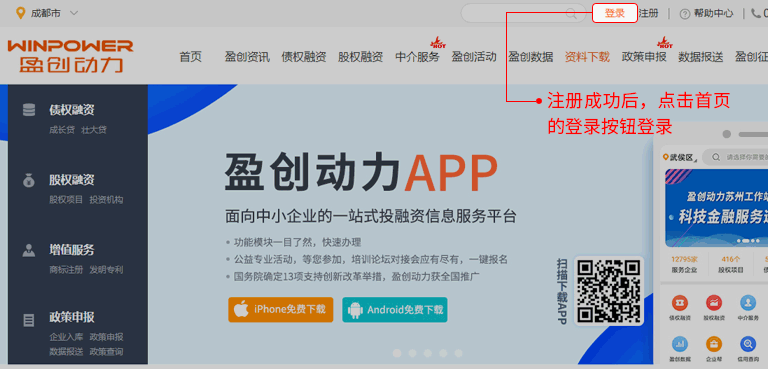 注册成功后,自动返回首页界面。已注册过的企业直接点击首页右上角登录,填写账户信息完成登录。